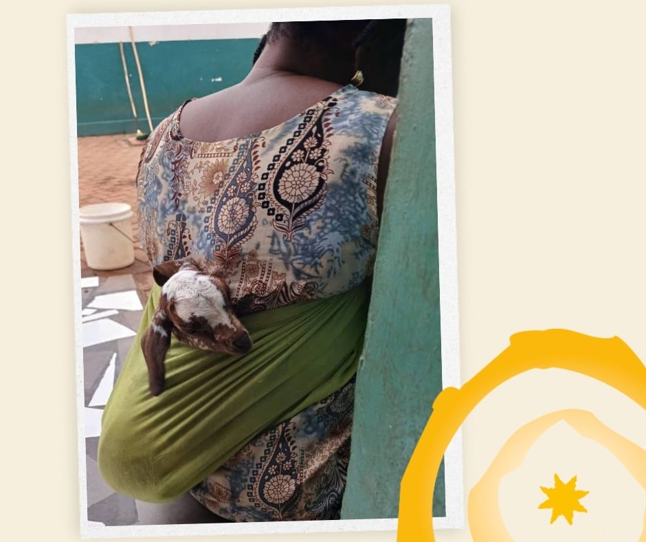 Toen de moeder van dit kleine geitje overleed, nam een van onze Mama’s de zorg over. Ze draagt het babygeitje met zich mee in een draagdoek, net als een echt kindje.