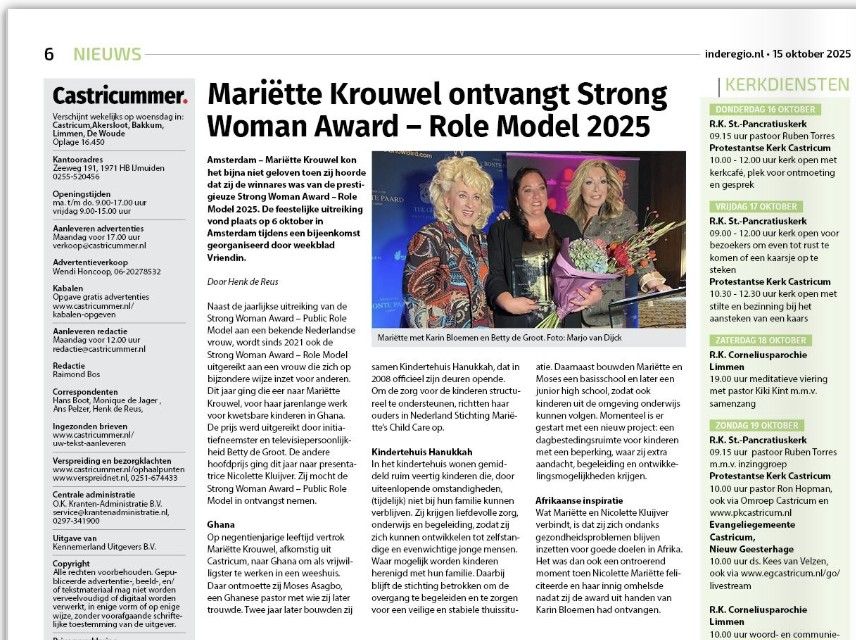 Krantenartikel over Mariëtte Krouwel na het ontvangen van de Strong Woman Award – Role Model 2025 voor haar inzet voor Hanukkah in Ghana.